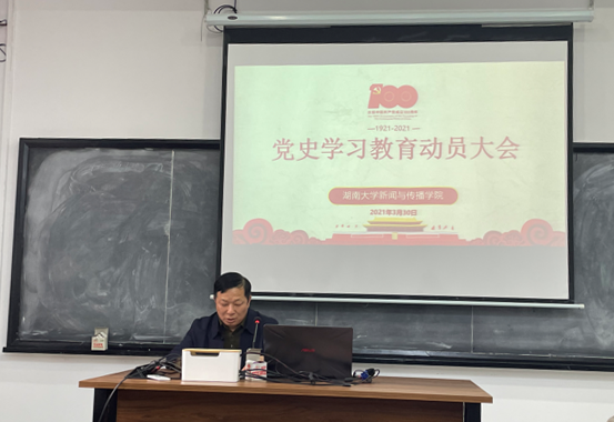 为深入贯彻习近平总书记在党史学习教育动员大会上的重要讲话精神,进一步激发基层党组织活力,以积极的面貌庆祝建党100周年,3月30日,新闻与传播学院在北楼312教室召开党史学习教育员大会暨第一次专题党课。大会由学院党委副书记李洪玉主持,党委书记胡建国作动员并做第一次专题党课,学院领导班子、学院全体教职工党员参加了此次大会。
