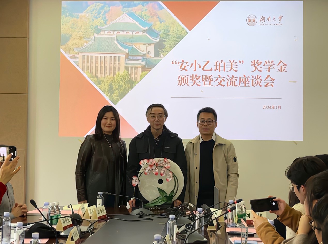2024年1月5日下午14时30分,“安小乙珀美”奖学金颁奖暨交流座谈会在北楼307室举行。此次会议特别邀请到2000级新闻专业校友,浙江校友会副会长、杭州安小乙进出口有限公司总经理、浙江珀美文化传媒有限公司总经理安超先生及其家人陈彬彬、安小乙、安小棉,2000级新闻专业校友贺春禄重返校园,参加此次会议。湖南大学新闻与传播学院党委书记杨永锋,湖南大学校友工作办公室主任李劲松,湖南大学发展联络处处长兼教育基金会秘书长邓利华,湖南大学发展联络处副处长兼教育基金会副秘书长左鑫,湖南大学新闻与传播学院党委副书记郭少滨,湖南大学艺术教育中心副主任穆莉花,湖南大学教育基金会联络与服务部副主管伍旺,湖南大学教育基金会筹资专员向叶兵,湖南大学新闻与传播学院学工办主任刘佳出席此次会议。