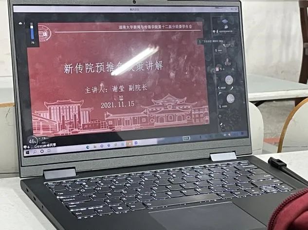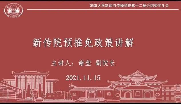 11月15日晚19:30,新闻与传播学院预推免政策讲解讲座通过腾讯会议在线上召开。本次讲座由新闻与传播学院副院长谢莹担任主讲,院团委书记、本科2019级辅导员杨湘雨老师出席。讲座由学生会学习部组织,旨在帮助低年级同学明确推免相关要求,解答同学们对于推免政策的疑惑。
