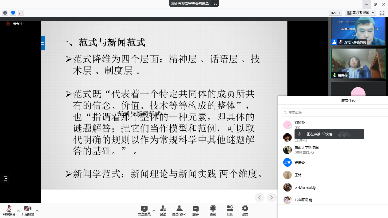 11月9日下午,岳麓传媒论坛第98期于“云端”腾讯会议室举行。此次学术讲座以“中国特色社会主义新闻学的新闻范式:宣传、专业、交往”为主题,由中国社会科学院新闻与传播研究所研究员、博士生导师曾庆香担任主讲嘉宾,湖南大学新闻与传播学院特聘教授、岳麓学者雷跃捷担任主持人,学院师生200余人线上参与。讲座由湖南大学新闻与传播学院联合湖南大学马克思主义新闻观研究中心举办,为“湖南大学马克思主义新闻观系列讲座”第十二讲。
