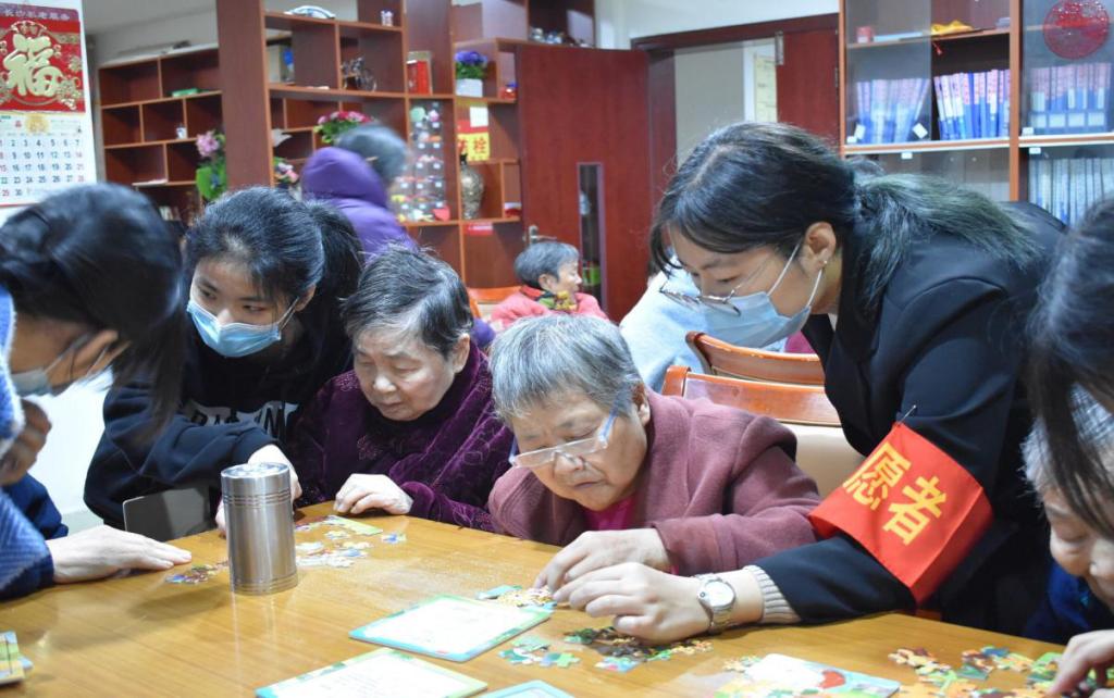 (志愿者与老人一起拼图)
