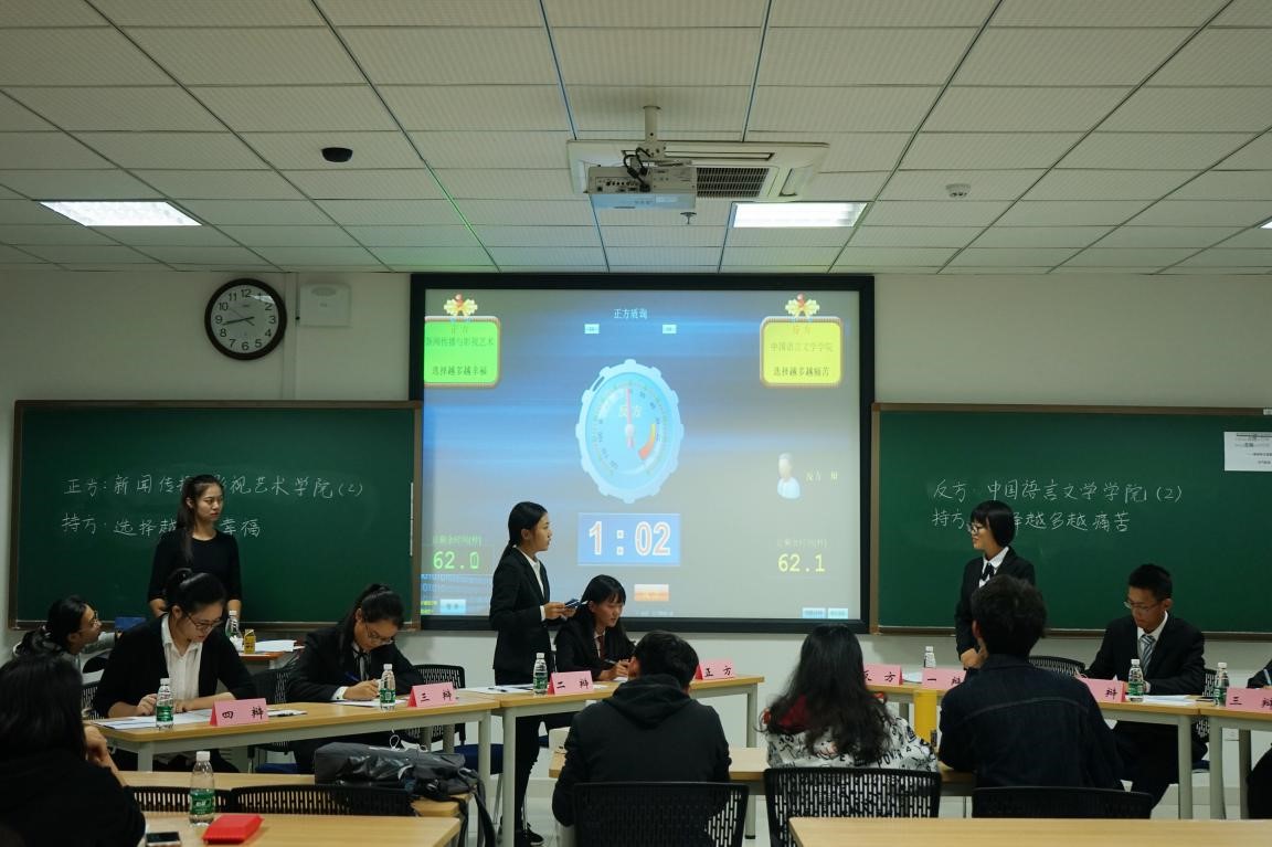 10月13日晚,“小院杯”辩论赛第二场圆满结束。本次辩论赛辩题为“选择越多越幸福还是选择越多越痛苦”。正方代表为新闻传播与影视艺术学院,反方代表为中国语言文学学院。比赛的评委由各学院优秀辩手或辩论经验丰富的大二学生担任。比赛经过立论、质询、对辩、盘问、自由辩论和总结,共历时一个半小时。比赛期间,双方选手唇枪舌剑,你来我往,引经据典,陈词论证。