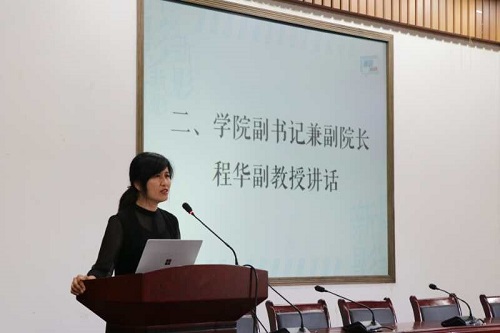 程华书记围绕"为什么要读大学""的主题讲述了大学的意义。她认为,大学是连接校园和社会的一座桥梁,"大学是同学们从青涩走向成熟、依赖走向独立、从学校人走向社会人的关键时期,帮助大家在走向社会前做好充分准备"。而关于"怎样读大学",程华书记向新生们提出三个要求:完成学业,打好理论基础;多多实践,丰富实践经验;完善人格,提高自我修养。