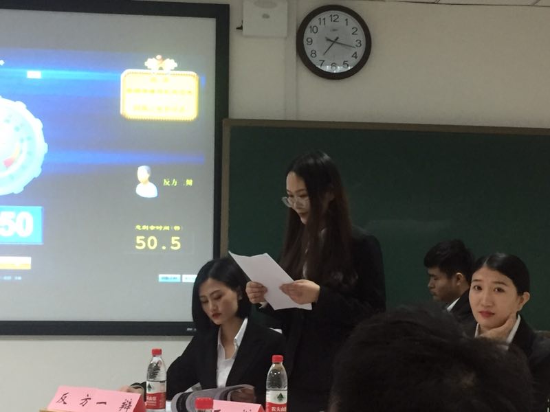 在双方简洁的自我介绍之后,比赛正式开始,双方就“盲目大流更可悲”还是“固执己见更可悲”的问题展开辩论,我院持反方观点,即“固执己见更可悲“。
