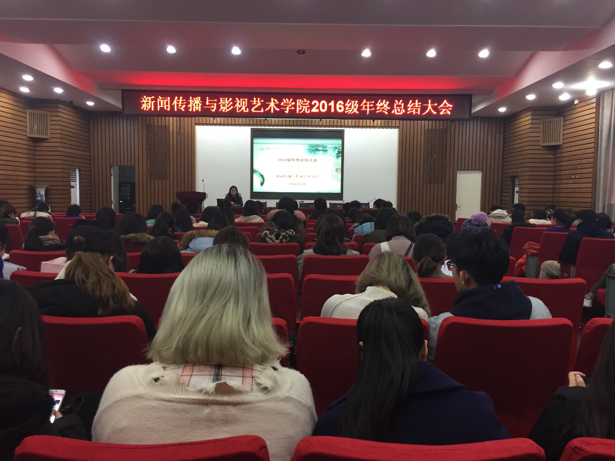 1月9日下午三点,湖南大学新闻传播与影视艺术学院2016级全体同学在湖南大学教学北楼217报告厅召开年终总结大会。本次大会由新影院学工办主任、16级辅导员刘婵老师主持。