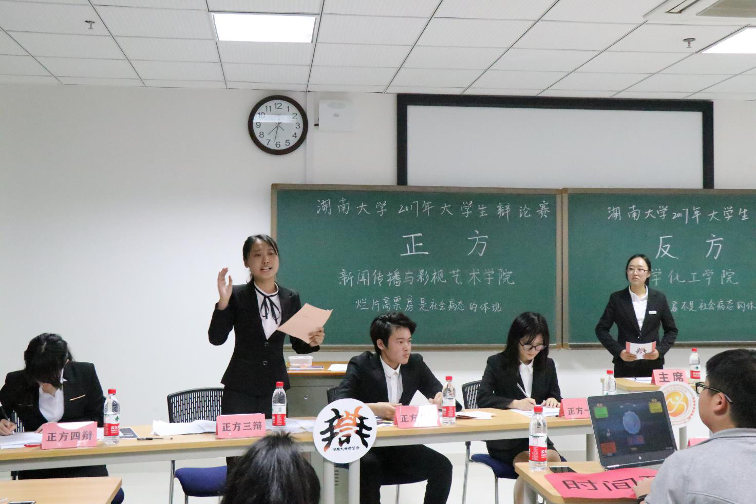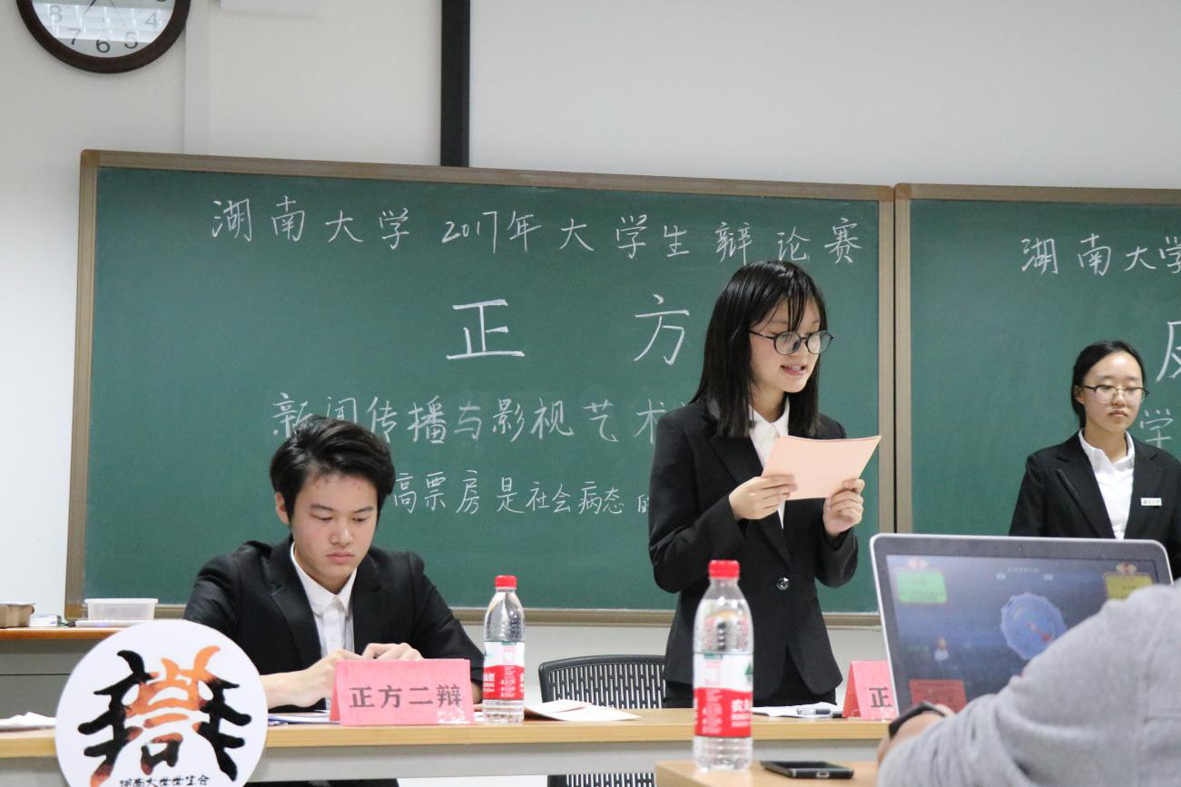 12月3日,湖南大学“华为杯”2017大学生辩论赛在研究生院楼进行,19个院的20支队伍齐聚一堂,共同在辩论赛中发声发亮。晚上7点,新闻传播与影视艺术学院对阵化学化工学院,最终新影院取得了本场比赛的胜利。
