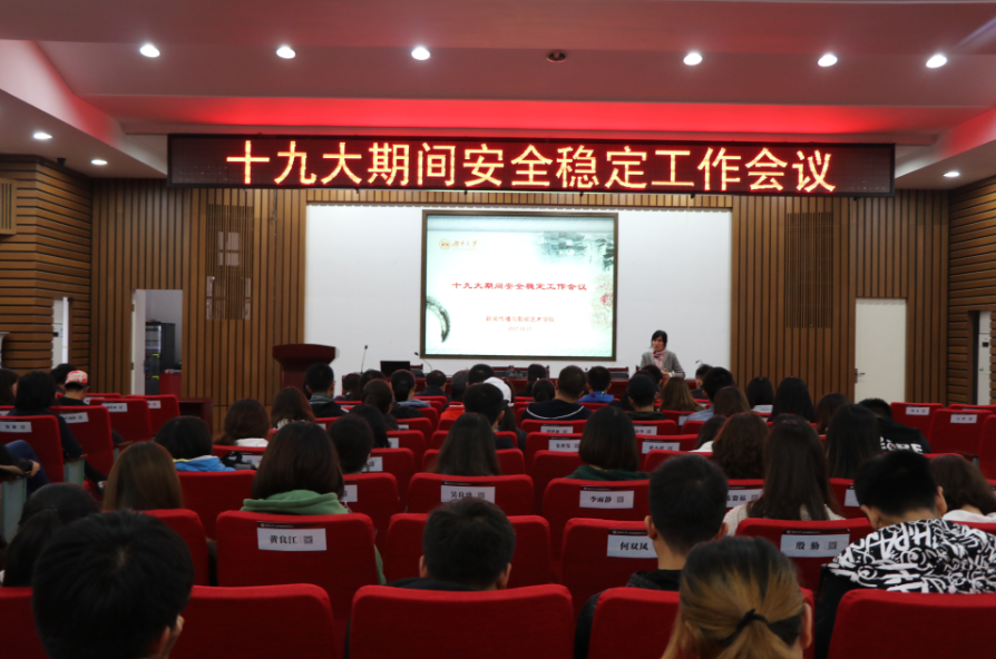 10月17日中午12点,湖南大学新闻传播与影视艺术学院在北楼217教室召开学生干部大会,会议部署了十九大期间有关安全稳定方面的工作。学院党委书记胡建国,党委副书记兼副院长程华,学工办主任刘婵,辅导员刘佳、丁杨、潘少光老师出席会议。学院分团委、学生会全体成员,研究生会主要干部、年级长、团总支以及各班班长、团支书参加会议。本次会议由程华副书记主持。