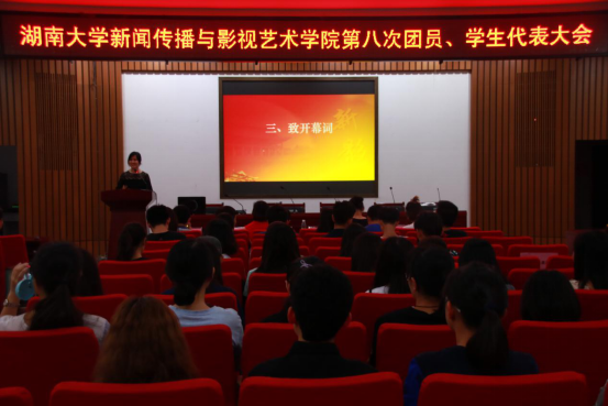 6月6日晚七点,新闻传播与影视艺术学院第八次团员、学生代表大会在北楼217顺利举行。湖南大学团委唐薇老师,湖南大学新闻传播与影视艺术学院党委副书记兼副院长程华副教授,学院团委书记、学工办主任刘婵老师,2014级辅导员丁杨老师,辅导员潘少光老师以及各兄弟学院学生会主席出席本次会议。