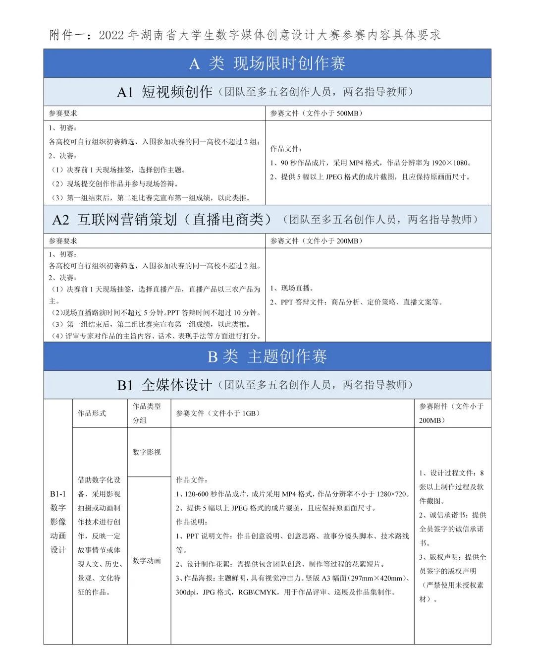 A 类为现场限时创作赛。各组现场抽签决定参赛主题,限时 24 小时内完成。A 类包括:A1 短视频创作;A2 互联网营销策划(直播电商类)。A类 A1 赛项或 A2 赛项,每个高校选派队伍不多于 2 个(每个队伍学生不超过 5 人,指导教师不超过 2 人,各队伍人员不可重复)。A1 短视频创作(24 小时现场创作),现场公布主题,限时(24 小时)进行创作,现场评选,作品形式包括但不限于实景拍摄、数字动画等。A2 互联网营销策划(直播电商类),根据主题进行直播营销策划,决赛前1天现场抽签,选择直播产品,直播产品由组委会提供。