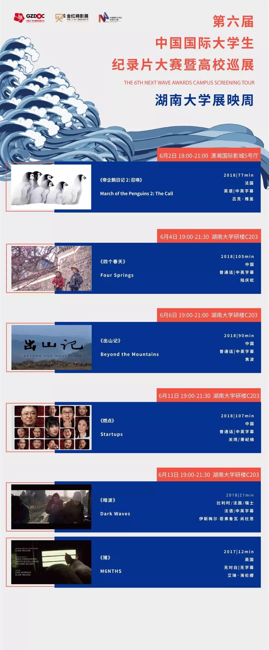 巡展将分别播放中国(广州)国际纪录片节组委会带来的6部优秀纪录片和湖南大学新闻传播与影视艺术广播电视编导往届优秀学生纪录片。(学生作品在组委会提供的纪录片后播放)届时相关展映影片主创人员及院内老师与现场观众就影片相关内容进行交流(无法到场的嘉宾将会与观众进行视频/语音连线)