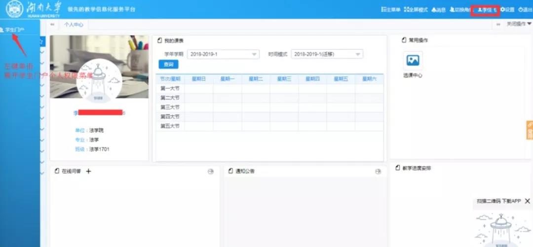 (二)请同学们完成选课后登陆“湖南大学教学信息化服务平台”学生门户“我的选课”课表核查更新后的已选课程列表,切勿使用第三方软件查看课表。