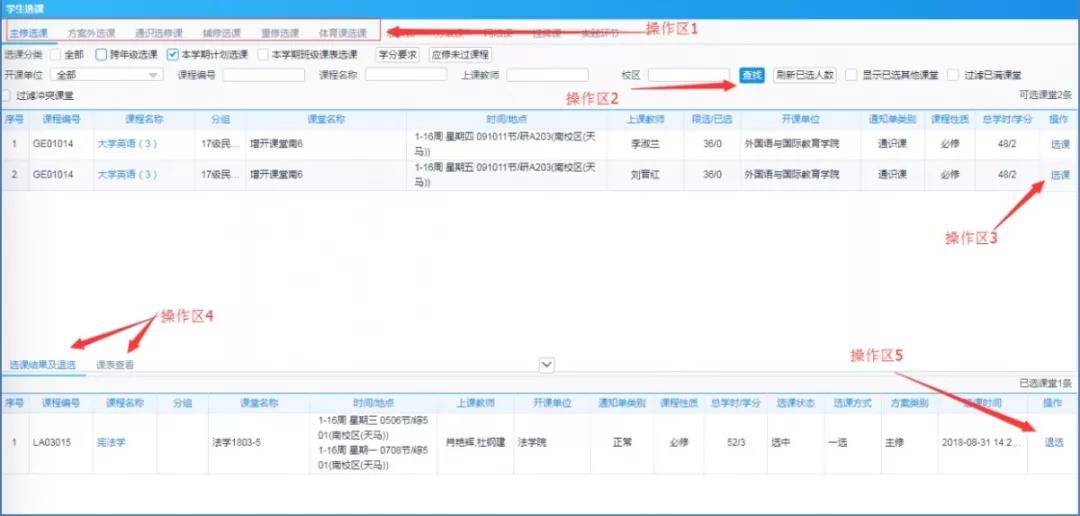 注意事项:退课界面操作区5位置没有“退课”按钮的课程,为本轮选课阶段不可退课程。