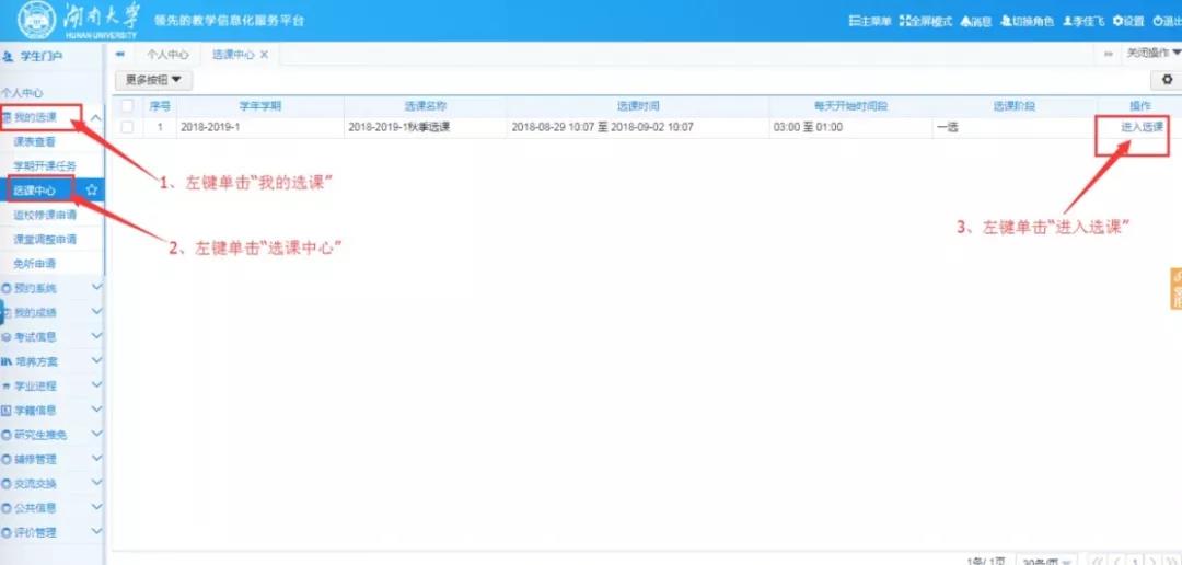 如图3.1在左侧菜单导航栏左键单击“学生门户”即可展开学生个人中心权限下的菜单项。如图3.2所示,依次左键点击“我的选课”→“选课中心”→“进入选课”即可进入个人选课界面。如果有多个选课活动,在图3.2界面将自动显示多条。