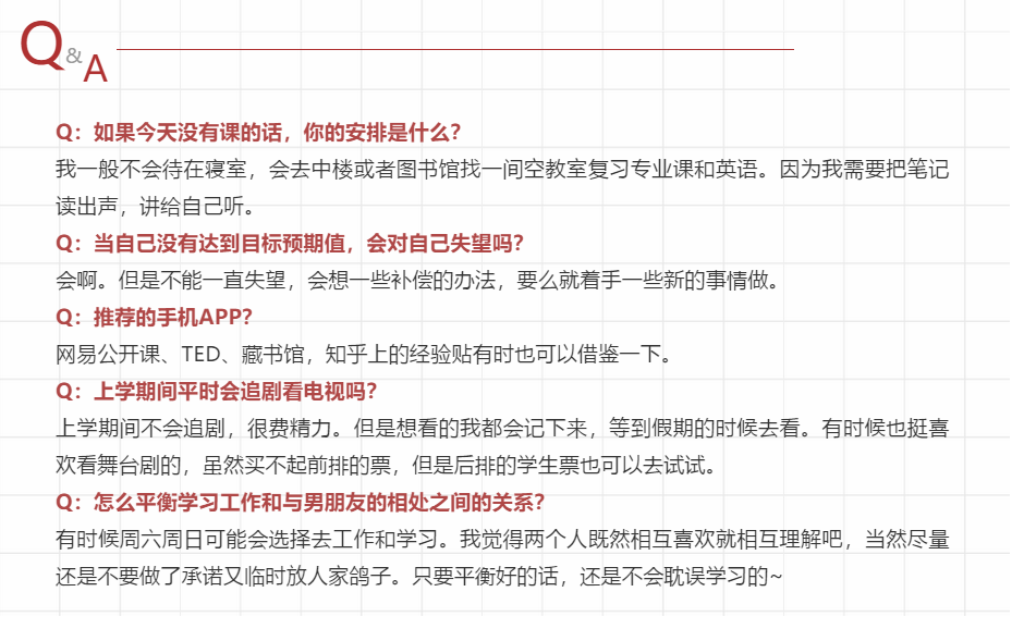 真相是,杜子璇有一种“焦虑感”。她坦言,焦虑有好有坏。坏处在于会给自己更大的压力,可能会乱了阵脚,但是焦虑感有时也会让人更有动力干劲去做事情。刷手机时间过长后她就会产生愧疚感,紧接着会更高效地投入学习来弥补;对期末考试的焦虑会促使她提前至少一个月把内容过上三四遍;假期放松的时间过长她会感到慌张,因为总会有新的目标催促她,像这学期她就提前了两周来学校投入学习、工作;再比如早上起床困难,她就会连定好几个闹钟来催促自己。