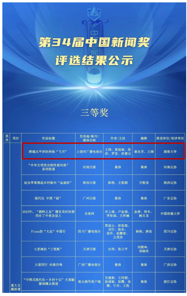2024年10 月 29 日,中国记协对第 34 届中国新闻奖评选结果进行公示,来自全国各级各类媒体的 378 件作品入选拟获奖名单。其中,上饶市广播电视台的新闻专题片《跨越太平洋的两地 “飞书”》荣获第 34 届中国新闻奖重大主题报道三等奖。这是自2016年担任试点报送单位以来,新闻与传播学院初评报送的作品第六次荣获中国新闻奖。